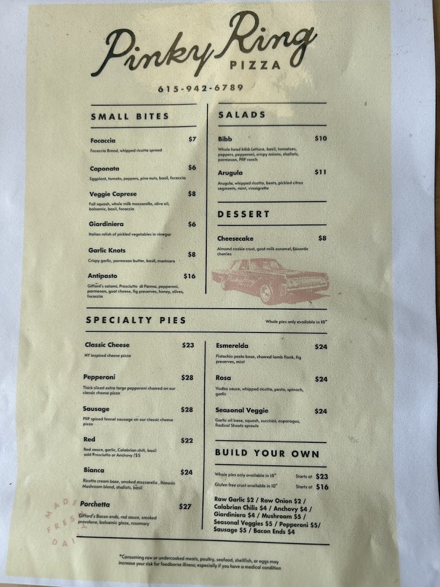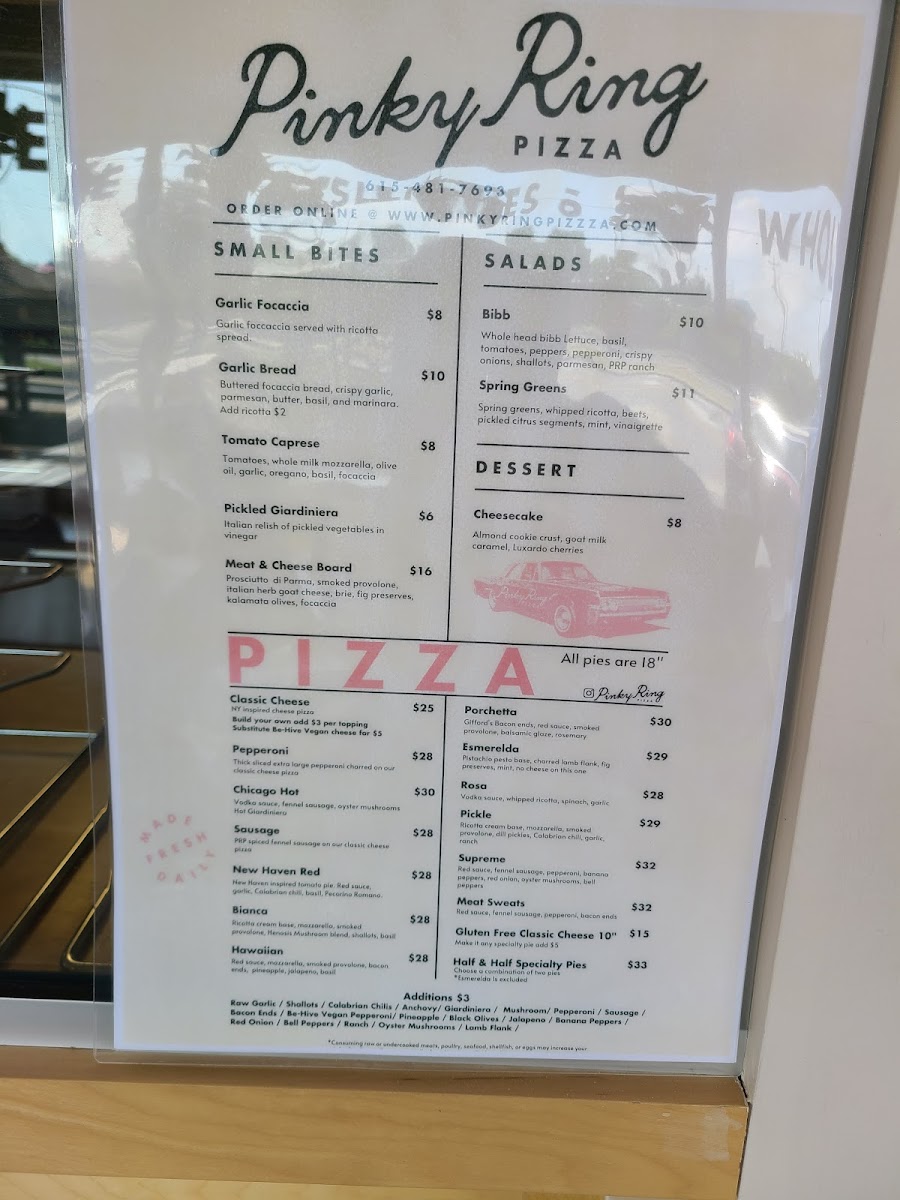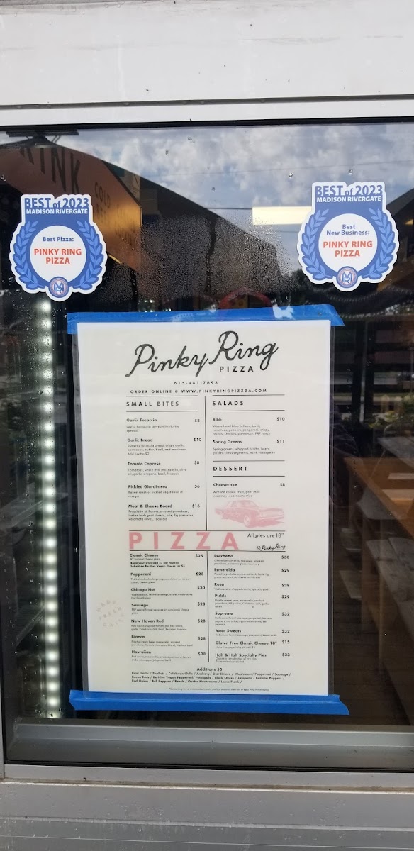 Located in the heart of Madison, Tennessee, Pinky Ring Pizza promises a delightful culinary experience with its diverse menu. For those seeking a tasty start, the small bites like Garlic Focaccia and the Meat & Cheese Board set the tone perfectly. Salads, such as the refreshing Bibb and Spring Greens, complement their offerings nicely.